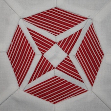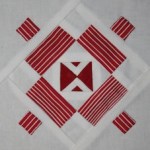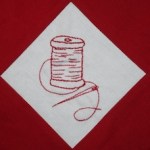 The following beautiful blocks are by: Judy Deonias (M-3, L-10, E-6), Andrea Murray (K-11, M-1) Judy Stadler (D-11), and me (D-4). Finally, Diane RS added some great redwork embroidery to the center square of D-13: a very thematic needle- and- spool-of-thread!